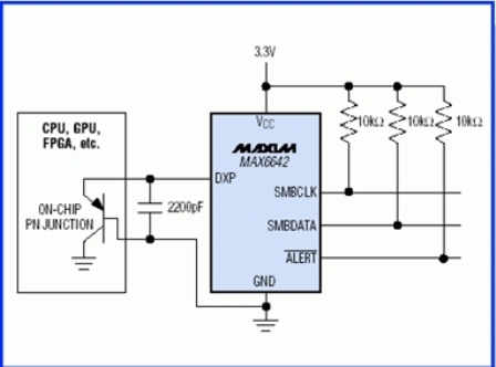 有些器件,尤其像CPU、圖形處理器(GPU)及FPGA等高性能IC,它們包含有用于測(cè)量溫度的、連接為二極管形式的雙極型晶體管。由于熱感應(yīng)晶體管就位于IC晶片上,因此其溫度測(cè)量精度遠(yuǎn)高于其他溫度傳感技術(shù),而且熱時(shí)間常數(shù)也相當(dāng)小。