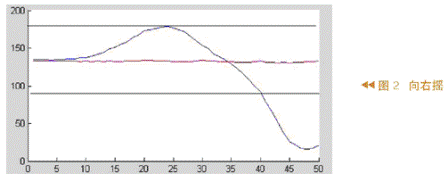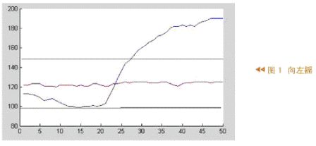 從圖1和圖2中可以看出,兩條黑線之間的數(shù)據(jù)很難斷定是哪個動作產生的,因為兩個動作都可能產生這樣的值。所以,利用黑線之外的數(shù)據(jù)來判定是向右還是向左搖。因為對于這兩個動作,黑線之外的數(shù)據(jù)有明顯的差異,數(shù)據(jù)相差很多。對于圖1這些數(shù)據(jù)大于150,圖2中這些數(shù)據(jù)小于90。因此這些數(shù)據(jù)至少相差60,可以很容易地將向左、向右的兩個動作區(qū)分開。