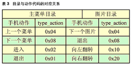 仿真器的外觀和操作類似一部移動電話,但是并不代表某個特定的設備,而是提供對其所支持的API 的正確實現(xiàn),每個命令按鈕對應著相應的API函數(shù)。從圖6中可以看到手機的導航鍵,我們更改了導航鍵的API函數(shù),使其從鼠標單擊觸發(fā)的方式轉換為串口動作代碼控制。首先,我們編寫了J2ME的串口接收程序,用于接收從單片機傳來的單字節(jié)的type_action值;然后將type_action以參數(shù)的形式傳給API,手機根據(jù)不同的type_action值執(zhí)行不同的動作,包括菜單上下翻、進出二級子菜單、圖片翻轉等。手機動作與type_action的對應關系如表3。