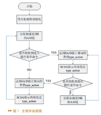 系統(tǒng)上電后,首先要對單片機的硬件系統(tǒng)進行初始化、配置寄存器等操作,之后才可以進行數(shù)據(jù)采集,將加速度的值進行A/D轉換,得到量化的值。圖片菜單是二級菜單,如果沒有接到演示系統(tǒng)傳給單片機進入二級菜單的指令,則單片機一直在主程序運行,不斷地采集A/D值、進行動作判定,并向演示系統(tǒng)發(fā)送type_action的指令。演示系統(tǒng)可根據(jù)接收到的type_action的類型采取相應的動作。如果單片機接收到進入二級菜單的命令,則進入圖片菜單,同時也執(zhí)行類似于主程序的動作判定程序,并不斷更新A/D采樣值,發(fā)送type_action,直到接收到退出二級菜單指令才退出。下面詳細介紹一下各個功能模塊的具體設置。