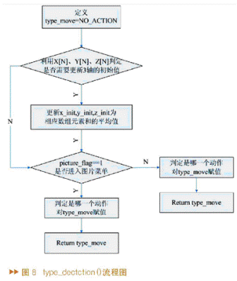 動作檢測主要是用獲得的三組數(shù)據(jù)值x_data[N]、y_data[N]、z_data[N]來判定當前動作是系統(tǒng)設定動作中的哪一個,如果符合,則發(fā)送這個動作對應的預定義值給演示終端,否則發(fā)送NO_ACTION。type_dectction()用來實現(xiàn)動作檢測,其中type_move為函數(shù)內部變量,用于記錄動作代碼。type_dectction()進行動作檢測的流程如圖8所示。