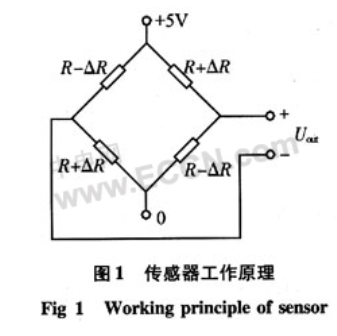 整個(gè)傳感器最關(guān)鍵的部分是其中的惠斯通電橋。當(dāng)外加磁場后,電橋的電阻變化,如圖1所示,引起傳感器輸出電壓Uout變化Uout=(△R/R)Ub,式中 Ub為傳感器工作電壓。