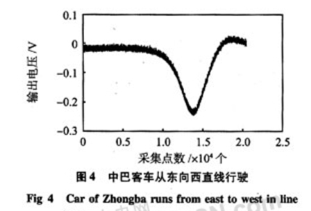 圖3、圖4比較可以看出:橫軸顯示圖3有效信號(hào)的跨度比圖4的小,圖3中輸出磁信號(hào)的幅值大于0.4V,而圖4中小于0.3 V,即圖3中的輸出信號(hào)幅值比圖4中的大。這是因?yàn)閳D3中的目標(biāo)移動(dòng)速度較大,另外,由于2個(gè)目標(biāo)不同,即對(duì)傳感器周圍的磁場影響程度不一樣,故測得的輸出信號(hào)幅值也不同。