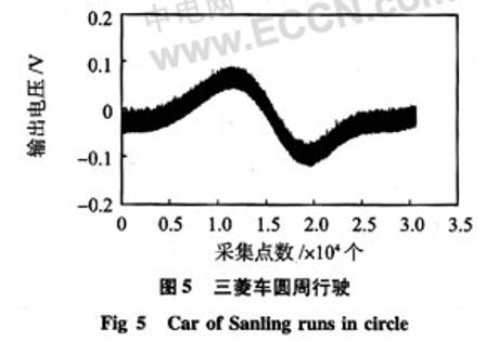 直線法和圓周法比較可以看出:圖5、圖3、圖4中的曲線變化規(guī)律明顯不同,曲線形狀變化較大是因?yàn)槟繕?biāo)運(yùn)動(dòng)方式不同,即影響磁場的方式不同,從而測得曲線有差別,圖5曲線中有個(gè)較大的峰值,是因?yàn)檐囋趫A周行駛時(shí),在采集信號(hào)期間車有一次通過傳感器敏感軸的正方向。另外,由于采集時(shí)間有限,所以,曲線沒有反映信號(hào)周期性變化,若采集時(shí)間達(dá)到2個(gè)周期,則會(huì)出現(xiàn)2個(gè)主峰。