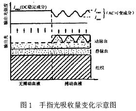 光電脈搏傳感器的研制和噪聲分析手指組織可以分成皮膚、肌肉、骨骼等非血液組織和血液組織, 其中非血液組織的光吸收量是恒定的, 而在血液中, 靜脈血的搏動(dòng)相對(duì)于動(dòng)脈血是十分微弱的, 可以忽略, 因此可以認(rèn)為光透過手指后的變化僅由動(dòng)脈血的充盈而引起的, 那么在恒定波長(zhǎng)的光源的照射下, 通過檢測(cè)透過手指的光強(qiáng)將可以間接測(cè)量到人體的脈搏信號(hào)。
