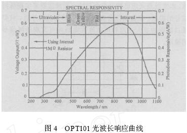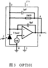 在本文中, 采用一種新型的光敏元件OPT101 , 該元件將感光部件和放大器集成在同一個(gè)芯片內(nèi)部, 這種集成化的設(shè)計(jì)方式有效地克服了后端運(yùn)算放大器空載電流輸出對(duì)光敏部件輸出電流的影響, 而且芯片輸出的電壓信號(hào)可以通過外部的精密電阻進(jìn)行調(diào)節(jié), 有利于芯片適應(yīng)整體的電路設(shè)計(jì), 同時(shí)芯片的集成化設(shè)計(jì)也能夠減小系統(tǒng)的功耗。