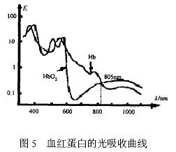 脈搏信號(hào)主要由動(dòng)脈血的充盈引起, 而血液中還原血紅蛋白( Hb) 和氧合血紅蛋白( HbO2 ) 含量變化將造成透光率的變化, 當(dāng)氧合血紅蛋白和還原血紅蛋白對(duì)光的吸收量相等時(shí), 透射光的強(qiáng)度將主要由動(dòng)脈血管的收縮和舒張引起, 此時(shí)能夠比較準(zhǔn)確地反映出脈搏信號(hào)。圖5 為血紅蛋白的光吸收曲線, 從圖中可以看出, 血液中HbO2 和Hb 對(duì)于不同波長(zhǎng)光的吸收系數(shù)的差異明顯, 而且2 條曲線好幾個(gè)不同的交點(diǎn), 考慮到在805 nm 波長(zhǎng)處, 血紅蛋白的光吸收率比較低, 那么透射過手指的光強(qiáng)較大, 有利于光敏器件的接收, 因此發(fā)射光源的波長(zhǎng)選擇為805 nm。