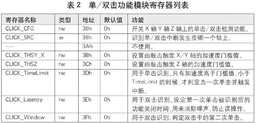 諾基亞8800CA手機除了有“翻轉靜音”的功能外,還有雙擊手機顯示時鐘的功能。其中敲擊的識別可以通過加速度傳感器來實現(xiàn)。LIS35DE集成了識別單擊或雙擊的功能模塊,通過寄存器設計就可以識別出單擊以及兩次單擊是否符合雙擊的條件。LIS35DE的單雙擊功能由地址為38h~3Fh的寄存器控制,如表2所示。