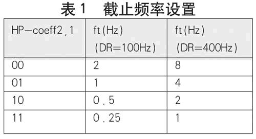 由于重力的存在,用戶不能簡單地在FF_WU_TSH1寄存器中設置統(tǒng)一的門檻值來作為晃動或者喚醒中斷的判定條件。為此,LIS35DE集成了高通濾波器,能夠濾除緩慢變化或不變的加速度(如重力加速度),并且可以選擇截止頻率,如表1所示。只有變化頻率高于截止頻率的加速度才能通過。