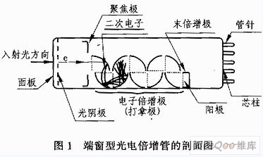 光電倍增管是一種真空器件。它由光電發(fā)射陰極(光陰極)和聚焦電極、電子倍增極及電子收集極(陽(yáng)極)等組成。典型的光電倍增管按入射光接收方式可分為端窗式和側(cè)窗式兩種類型。圖1所示為端窗型光電倍增管的剖面結(jié)構(gòu)圖。其主要工作過(guò)程如下: