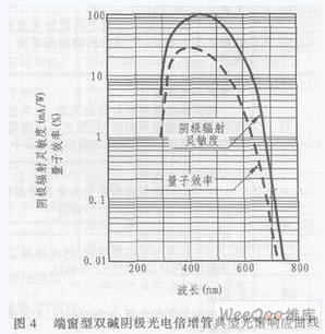 光電倍增管由陰極收入射光子的能量并將其轉(zhuǎn)換為光子,其轉(zhuǎn)換效率(陰極靈敏度)隨入射光的波長(zhǎng)而變。這種光陰極靈敏度與入射光波長(zhǎng)之間的關(guān)系叫做光譜響應(yīng)特性。圖4給出了雙堿光電倍增管(其光陰極材料為Sb-Rb-Cs和Sb-K-Cs)的典型光譜響應(yīng)曲線。