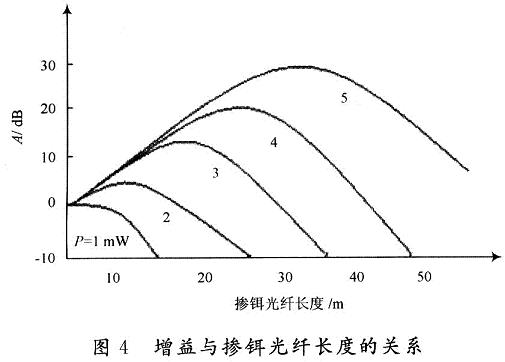 由于摻鉺光纖本身的損耗,造成信號(hào)光中被吸收掉的光子多于受激輻射產(chǎn)生的光子,引起增益下降。由上述討論可知,對(duì)于某個(gè)確定的入射泵浦功率,存在著一個(gè)摻鉺光纖的最佳長(zhǎng)度,使得增益最大。增益與摻鉺光纖長(zhǎng)度的關(guān)系如圖4所示。