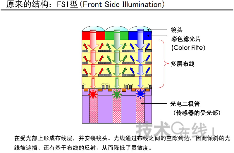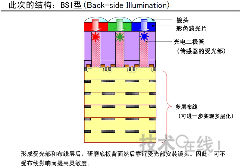 在BSI型CMOS傳感器中,可通過(guò)采用傳感器上面沒(méi)有布線層的結(jié)構(gòu)來(lái)提高采光率。研磨形成傳感器的硅底板,然后將鏡頭靠近傳感器安裝。此項(xiàng)工序采用了晶圓薄化和接合等大量面向MEMS使用的工藝技術(shù)。由于沒(méi)有妨礙光線入射的布線層,因此可提高靈敏度。東芝表示,若是已宣布量產(chǎn)的1.4μm產(chǎn)品,則可將靈敏度提高約40%。另外,該元件的光學(xué)格式為1/2.3英寸,幀速率為60幀/秒(支持1080p以及720p)。