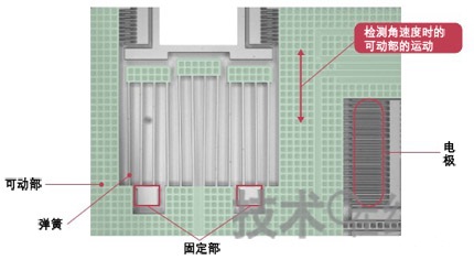 新傳感器由MEMS中常見的固定部、可動(dòng)部、連接固定部與可動(dòng)部的彈簧,以及檢測(cè)可動(dòng)部運(yùn)動(dòng)的電極構(gòu)成。利用電極靜電容量隨著可動(dòng)部的運(yùn)動(dòng)而發(fā)生變化的特性來檢測(cè)角速度和加速度(圖2)。檢測(cè)角速度的電極只有在彎道等使車輛轉(zhuǎn)向時(shí)才檢測(cè)信號(hào)。