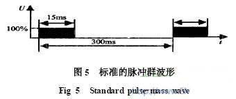 電磁兼容設(shè)計(jì)靠電磁兼容試驗(yàn)來驗(yàn)證與改進(jìn)?,F(xiàn)在,有了比較完善的電磁兼容試驗(yàn)方法和專門的試驗(yàn)設(shè)備。開關(guān)電器動作時(shí),形成強(qiáng)烈的干擾,產(chǎn)生瞬態(tài)脈沖。IEC61000-4-4標(biāo)準(zhǔn)對電快速瞬變脈沖干擾作出規(guī)定,分為單個(gè)脈沖、一群脈沖、脈沖群。脈沖群波形如圖5所示,周期為300ms,脈沖束寬度為15ms。