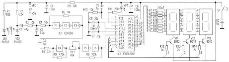 電路原理見附圖。電路由傳感器電路、信號(hào)放大和整形電路、單片機(jī)電路、數(shù)碼顯示電路等四部分組成。