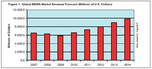 預(yù)計今年MEMS市場將增長11 .1%,達(dá)到65.54億美元,略高于2007年創(chuàng)下的高點(diǎn)65.50億美元。該市場之前兩年呈下降態(tài)勢,是其較短歷史中的首次下降,2008年銷售額下降到63億美元,2009年進(jìn)一步降到59億美元。