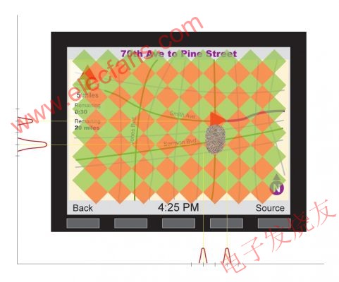 通過(guò)比較當(dāng)前基于電阻式觸摸屏和帶手勢(shì)識(shí)別的電容式觸摸屏的汽車HMI概念,我們可以發(fā)現(xiàn),新增手勢(shì)識(shí)別功能后,駕駛?cè)藛T對(duì)路面的關(guān)注程度在某些方面有所改善。通過(guò)電容式觸摸屏的手勢(shì)識(shí)別不僅是一種新的輸入方式,更使系統(tǒng)輸入提升到了一個(gè)新的層次。采用電容式觸摸屏,駕駛?cè)藛T仍然可以通過(guò)點(diǎn)擊瀏覽菜單結(jié)構(gòu),滑動(dòng)手指提高音量或者調(diào)節(jié)HVAC風(fēng)扇速度。不過(guò),真正重要的是其控制標(biāo)準(zhǔn)功能的簡(jiǎn)易度,比如控制駕駛過(guò)程中非常必要的導(dǎo)航功能。用戶不必緊盯著屏幕,只需一個(gè)簡(jiǎn)單的手勢(shì)即可實(shí)現(xiàn)縮小操作。屏幕上的任何區(qū)域都可以感知手勢(shì),因此駕駛?cè)藛T不必把手指放在特定的位置來(lái)完成操作。圖1顯示就是這種導(dǎo)航屏幕上的動(dòng)作感知說(shuō)明。