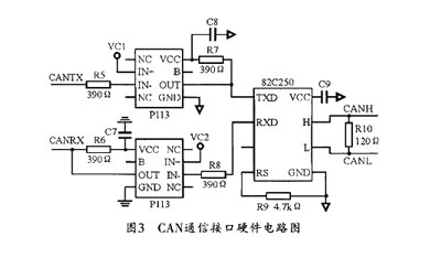 CAN通訊網(wǎng)絡(luò)模塊負責(zé)將啟動信號和檢測信號通過CAN網(wǎng)傳輸給汽車的中央處理器。中央處理器通過接收的信號做決策判斷。CAN總線通信方式靈活、抗干擾能力強,目前在汽車控制系統(tǒng)中應(yīng)用廣泛。CAN通訊接口硬件設(shè)計如圖3所示,其中82C250是CAN控制器和物理總線間的接口,它和CAN控制器之間采用光隔P113來提高系統(tǒng)的抗干擾能力。