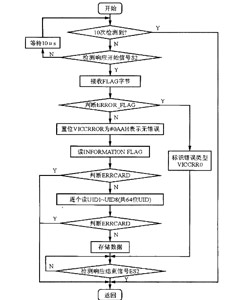 在MCU讀TAG-IT期間,由S6700掌握時鐘線控制權(quán)。S6700讀得數(shù)據(jù)后,通過DIN傳輸給MCU。在讀取數(shù)據(jù)時,MCU必須嚴格模擬TAG-IT的響應(yīng)時序,并通過傳輸來的FLAG來確定數(shù)據(jù)的正確性。只有在FLAG完全正確時,才會繼續(xù)接受響應(yīng)內(nèi)容,否則,系統(tǒng)將結(jié)束讀卡過程。圖5給出了讀應(yīng)答器的子程序圖。