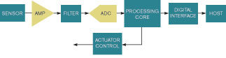傳感器的模擬信號必須經(jīng)過數(shù)字化才能供系統(tǒng)使用,并且信號要經(jīng)過放大、濾波和數(shù)字化(圖1)。每一級通常都涉及一只圍繞著一些無源元件的器件,以正確地實現(xiàn)一個應(yīng)用。一旦對信號做了數(shù)字化,就可以將其送給微處理器上的控制系統(tǒng),或整理數(shù)據(jù)后通過一個通信協(xié)議送至一只主處理器。協(xié)議可以根據(jù)需要使用傳感器數(shù)據(jù)。