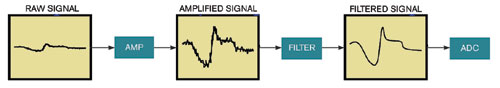 圖2,傳感器的信號路徑中包括放大器、濾波器和ADC。濾波器的設(shè)計用于去除信號中的噪聲,限制帶寬。