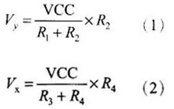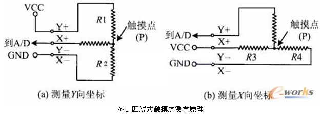 觸摸層的兩個(gè)金屬導(dǎo)電層分別用來(lái)測(cè)量X軸和Y軸方向的坐標(biāo)。用于X坐標(biāo)測(cè)量的導(dǎo)電層從左右兩端引出兩個(gè)電極,記為X+和X-。用于Y坐標(biāo)測(cè)量的導(dǎo)電層從上下兩端引出兩個(gè)電極,記為Y+和Y-。這就是四線電阻觸摸屏的引線構(gòu)成。當(dāng)在一對(duì)電極上施加電壓時(shí),在該導(dǎo)電層上就會(huì)形成均勻連接的電壓分布國(guó)。若在X方向的電極對(duì)上施加一確定的電壓,而Y方向電極對(duì)上不加電壓時(shí),在X平行電壓場(chǎng)中,觸點(diǎn)處的電壓值可在在Y+(或Y-)電極上反映出來(lái),通過(guò)測(cè)量Y+電極對(duì)地的電壓大小,便可得知觸點(diǎn)的X坐標(biāo)值。同理,當(dāng)在Y電極對(duì)上加電壓,而X電極對(duì)上不加電壓時(shí),通過(guò)測(cè)量X+電極的電壓,便可得知觸點(diǎn)的Y坐標(biāo)。測(cè)量原理如圖1所示。