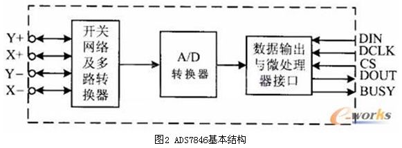 觸摸屏控制器有多種,主要的功能均是在微處理器的控制下向觸摸屏的兩個(gè)方向分時(shí)施加電壓,并將相應(yīng)的電壓信號(hào)傳送給自身A/D轉(zhuǎn)換器,在微處理器SPI口提供的同步時(shí)鐘作用下將數(shù)字信號(hào)讀入微處理器。控制器ADS7846基本結(jié)構(gòu)如圖2所示。