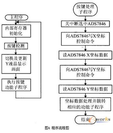 按照以上設(shè)計(jì)思想設(shè)計(jì)了應(yīng)用軟件,圖4為主程序與觸摸屏輸入檢測(cè)部分的程序流程圖。其中,坐標(biāo)數(shù)據(jù)處理通常采用查表的方法,將用戶命令的坐標(biāo)形成數(shù)據(jù)表,利用獲得的坐標(biāo)信息進(jìn)行變換快速查表,從而提高軟件的運(yùn)行速度。