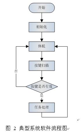 圖2是一個具有休眠功能的典型系統(tǒng)軟件流程圖。系統(tǒng)初始化后進入休眠模式,經(jīng)過一段時間的延時后喚醒掃描按鍵模塊,進行按鍵掃描。如果有按鍵按下,軟件判斷是否有效。如果無效按鍵按下,那么系統(tǒng)繼續(xù)進入休眠模式。如果軟件判斷按鍵有效,那么喚醒系統(tǒng),觸發(fā)任務處理進程。當處理完所有任務后,系統(tǒng)又重新進入休眠狀態(tài)。這是個典型的具有休眠功能的系統(tǒng)工作流程圖,它的優(yōu)點就是此軟件流程簡單易懂、容易實現(xiàn),一般可以滿足大多數(shù)場合的應用。但是,如果系統(tǒng)任務處理消耗了較多的CPU處理時間,那么為了達到目標平均工作電流,就需要相應增加休眠時間。同時降低了按鍵掃描的頻率,從而加長了系統(tǒng)喚醒的響應時間。因此,此方法適合比較簡單的、系統(tǒng)任務不復雜的應用。
