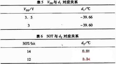 式中,d1和d2為特定系數(shù)。d1的取值與SHT11工作電壓有關(guān),d2的取值則與SHT11內(nèi)部A/D轉(zhuǎn)換器采用的分辨率有關(guān),其對應(yīng)關(guān)系分別如表5和表6所示。