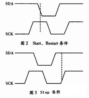 Start和Stop條件:主機通過發(fā)送Start條件啟動通信,Start、Repeated Start條件如圖2所示,Stop條件如圖3所示。