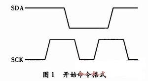 (1)傳輸開始。在SCK為高時使SDA由高電平變?yōu)榈碗娖?,并在下一個SCK為高時將SDA升高,如圖1所示。