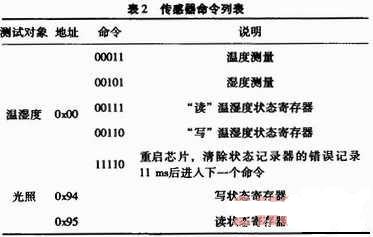 (2)地址與測試對象命令。該命令包含3個地址位和5個命令位,其后為應(yīng)答ACK位,表示SHT11正確收到命令。傳感器命令列表,如表2所示。