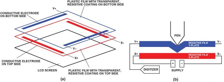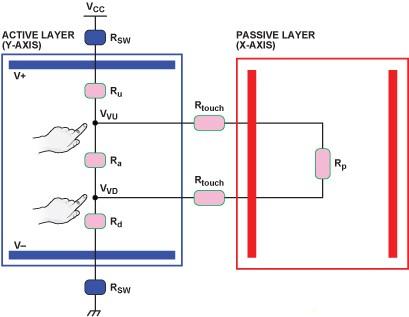連接直流電壓的層稱為“有源”層,電流與其阻抗成反比。測(cè)量電壓的層稱為“無(wú)源”層,無(wú)相關(guān)電流流經(jīng)該層。發(fā)生單點(diǎn)觸摸時(shí),在有源層中形成一個(gè)分壓器,無(wú)源層電壓測(cè)量通過(guò)一個(gè)模數(shù)轉(zhuǎn)換器讀取與觸摸點(diǎn)和負(fù)電極之間的距離成比例的電壓1.