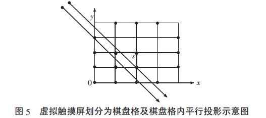 具體實施中,為準(zhǔn)確識別手指位置,將虛擬觸摸屏劃分為n×n 的棋盤格,如圖5 所示,由于攝像頭離棋盤格距離較遠(yuǎn),且每個棋盤格足夠小,于是可以假設(shè)在棋盤格內(nèi),攝像頭拍攝的光線是平行的,以簡化點位置的轉(zhuǎn)換。