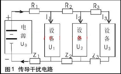 傳導(dǎo)干擾主要通過(guò)電路的共用導(dǎo)體傳播,典型的結(jié)構(gòu)是共電源線和共地線,圖1是典型傳導(dǎo)干擾電路示意圖。R為電源線上電阻,Z為地線上電阻,U為支路電壓,I為支路電流。