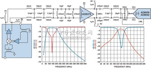AD8376的電流輸出型電路具有高輸出阻抗,因此其差分輸出需要接150 Ω電阻實現(xiàn)電壓輸出。另一個差分濾波器放置在AD8376和ADC之間,用于衰減二階和三階諧波失真成分,因此該150 Ω負載可以被分成兩部分。首先將300 Ω電阻安裝于AD8376的輸出端。另一個300 Ω電阻由兩個165 Ω電阻和ADC的3 kΩ輸入阻抗構(gòu)成。兩個165 Ω電阻同時為ADC輸入提供直流共模電壓。LC濾波器的輸入和輸出阻抗均為300 Ω。對于高中頻應用,信號源和負載的阻抗的完美匹配是非常重要的。完整接口如圖4所示。
