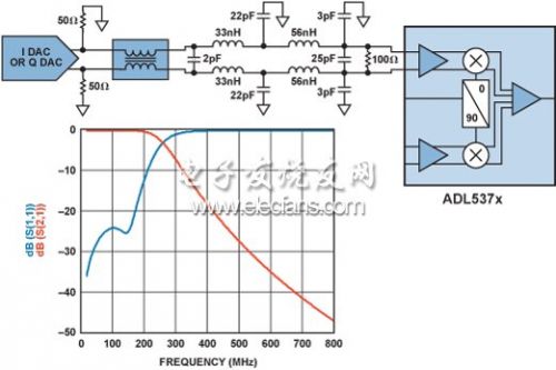ADL5372的輸入電路需要0.5 V共模電壓,由流經(jīng)50 Ω電阻的10 mA直流電流提供。0 mA至20 mA交流電流由兩個50 Ω電阻和一個100 Ω電阻共享。因此調(diào)制器輸入的交流電壓為20 mA × ((50 × 2) || 100) = 1 V p-p。TxDAC與調(diào)制器之間的濾波器用于去除高頻雜散和諧波成分。濾波器的輸入和輸出阻抗為100 Ω。完整接口如圖6所示。
