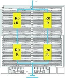 現(xiàn)代傳感器系統(tǒng)主要由兩個元件組成 —基本傳感器和信號處理專用集成電路 (ASIC)(圖 1)?,F(xiàn)已證明,后來由 Lord Klevin 于 1857 年發(fā)現(xiàn)的各向異性磁阻效應(yīng)特別適用于檢測磁場。首先考慮通常具有多種磁疇結(jié)構(gòu)的鐵磁性材料。這些稱之為韋斯磁疇的結(jié)構(gòu),其內(nèi)部磁化的方向彼此不同。如果將這種材料平鋪為一薄層,那么磁化矢量處于材料層平面方向。另外,可較精確地假設(shè)只存在一個磁疇。當這種元件暴露于外部磁場中時,后者會改變內(nèi)部磁化矢量的方向。如果同時一股電流通過該元件,就會產(chǎn)生電阻(圖 2),這取決于電流和磁化之間的角度。當電流和磁化方向彼此成直角時,電阻最小,當二者平行時,電阻最大。電阻變化的大小取決于材料。鐵磁性材料的性質(zhì)也決定對溫度的依賴性。電阻最大變化為 2.2% 并且對溫度變化反應(yīng)良好的最佳合金是 81% 的鎳和 19% 的鐵組成的合金。恩智浦所有傳感器系統(tǒng)中的基本傳感器都采用這種強磁鐵鎳合金。在惠斯登電橋電路中單獨配置幾個 AMR 電阻,以增強輸出信號并改善溫度反應(yīng)特性。此電路也可在制造過程中進行微調(diào)。圖 3 顯示如何在裸片上配置 AMR 元件。