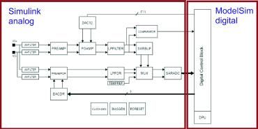 確定磁場之后是傳感器系統(tǒng)仿真。AMR 元件的電阻變化是各向異性磁阻效應(yīng)的直接結(jié)果。這樣,磁場仿真的結(jié)果會導(dǎo)致代表信號處理中輸入信號的電阻發(fā)生變化。對模擬前端進行建??刹捎?Simulink。這種行為模型是概念設(shè)計的產(chǎn)物,標志著產(chǎn)品開發(fā)的起點。每個 Simulink 塊對應(yīng)一個模擬信號處理組件,例如放大器或過濾器。但是,尚未考慮模擬組件的控制部分,這由數(shù)字系統(tǒng)實現(xiàn)。HDL 設(shè)計則仿真通過數(shù)字方法實現(xiàn)的功能,而且在完成產(chǎn)品開發(fā)之后就會最終成形。因此,整體系統(tǒng)仿真是 Simulink 對模擬組件的行為模型以及 ModelSim 對 HDL 設(shè)計的共同仿真(圖8)??赏ㄟ^仿真從概念階段順利過渡到 HDL 設(shè)計及后續(xù)階段。在共同仿真中,可用 ModelSim 中部署的 Verilog 代碼逐漸代替 Simulink 參考模型,從而可逐項驗證 HDL 設(shè)計??沙掷m(xù)進行此過程,直到在 Verilog 中實現(xiàn)整個數(shù)字部件,而模擬系統(tǒng)部件仍保持為 Simulink 模型。此工具組合也已證明對 IC 評估同樣有用。自始至終使用這種工具可以更容易理解 IC 行為,并可創(chuàng)建用來分析和解釋任何錯誤的框架。這些工具的主要好處在于,能夠更快速、更準確地答復(fù)客戶的查詢,以及更好地了解與環(huán)境條件相關(guān)的傳感器功能。