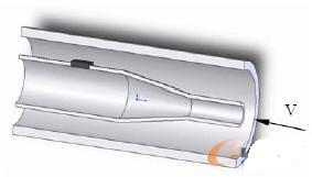 作者所在的研究組在前期應(yīng)用壓力梯度法和壓力互相關(guān)法測(cè)量液壓系統(tǒng)流量進(jìn)行了理論和實(shí)驗(yàn)研究,取得了一定進(jìn)展,在此基礎(chǔ)上,提出這種不需要引壓,直接讓 MEMS敏感芯體在管內(nèi)獲得與流量對(duì)應(yīng)的差壓信號(hào)的新方法。相比之下新方法在對(duì)系統(tǒng)較低擾動(dòng)的前提下更易獲得較高的信號(hào)水平,精度能滿足一般液壓系統(tǒng),具有高的動(dòng)態(tài)測(cè)量頻寬。其機(jī)理是利用內(nèi)置于管道中特殊設(shè)計(jì)的異徑結(jié)構(gòu)裝置,如圖1所示,對(duì)內(nèi)外流體分別產(chǎn)生收縮和擴(kuò)壓雙效作用,獲得低壓損、低能耗的微小壓力差,通過置于上面的MEMS敏感芯體測(cè)取,并根據(jù)建立的壓差-流量關(guān)系模型,及仿真手段和實(shí)驗(yàn)測(cè)試得出該狀態(tài)下的流量值。