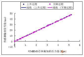由圖可以看出,在額定工作壓力量程范圍內(nèi),芯體所受的壓差與輸出信號(hào)呈良好的線性關(guān)系,傳感器輸出信號(hào)隨壓力上升和下降過程中線性重合度非常好。多次標(biāo)定結(jié)果顯示傳感器有良好的重復(fù)性,這為以后實(shí)驗(yàn)數(shù)據(jù)的可靠性提供了有力保障,同時(shí)也說明所選壓阻式MEMS微型壓差敏感芯體的性能滿足實(shí)驗(yàn)要求。