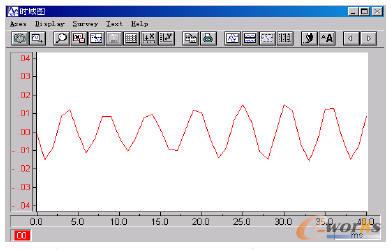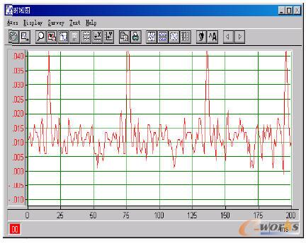 在動(dòng)態(tài)試驗(yàn)中,保持液壓泵提供20L/min的工作流量,使用Wavebook512信號(hào)系統(tǒng)對(duì)MEMS傳感器輸出流量信號(hào)進(jìn)行采集,如圖7所示。盡管受到系統(tǒng)內(nèi)閥口、管路等造成的干擾,而且由于柱塞泵各柱塞在制造、安裝以及使用中產(chǎn)生的誤差和磨損造成的不均勻現(xiàn)象,導(dǎo)致流量波動(dòng)曲線有些變形,但是還是可以很清晰的看出流量的波動(dòng)周期約為60ms,即頻率16.7Hz。由于電動(dòng)機(jī)工作在50Hz頻率,額定轉(zhuǎn)速1000r/min,因此相應(yīng)的軸向柱塞泵運(yùn)轉(zhuǎn)頻率也是1000/60=16.7Hz,這正與上面的測(cè)量結(jié)果吻合。