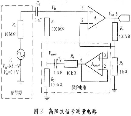 圖2中下側(cè)虛線框內(nèi)的電路為保護(hù)電路,從放大器A1的反相輸入端引入信號(hào)到保護(hù)放大器Aguard的正相輸入端,保護(hù)放大器實(shí)則為電壓跟隨器。電阻R1的低電位端加上保護(hù)電位Vguard,當(dāng)R2>>R3時(shí)。在一定頻率范圍內(nèi),保護(hù)電位近似等于高阻抗輸入端電位Vin,可以通過調(diào)節(jié)R2,R3的阻值來改變保護(hù)電位的大小。保護(hù)電位由保護(hù)緩沖放大器提供,而不是由信號(hào)源提供.電阻R1的低阻抗端加上保護(hù)電位后,其電壓降將大大減小,流經(jīng)它的電流也將大大減小。