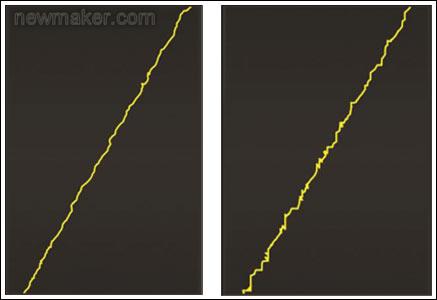 圖3. 一個機器臂握著4mm金屬片畫的直線。左側(cè)使用的是高SNR的觸摸屏控制器;右側(cè)使用的是低SNR觸摸屏控制器