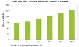 未來幾年,中國市場上增長最快的MEMS領域?qū)⑹鞘謾C與消費市場的麥克風、加速計和陀螺儀。IHS公司預計,2015年該市場的MEMS銷售額將達到13億美元,2011-2015年復合年度增長率為21%。