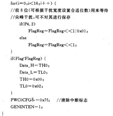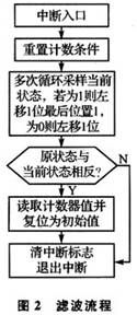 根據(jù)軟件濾波設(shè)計(jì)思想,濾波子程序由主程序在信號(hào)狀態(tài)發(fā)生變化,進(jìn)入中斷時(shí)調(diào)用,圖2給出了濾波程序流程。對(duì)照?qǐng)D1中4種Section來(lái)分析流程圖。當(dāng)有邊沿或干擾信號(hào)(信號(hào)周期大于計(jì)數(shù)時(shí)鐘周期)到來(lái)時(shí),VRS51L3074單片機(jī)的PWC計(jì)數(shù)停止條件滿(mǎn)足,系統(tǒng)進(jìn)入中斷服務(wù)子程序。在中斷子程序中,首先重置脈寬計(jì)數(shù)條件,然后對(duì)當(dāng)前狀態(tài)進(jìn)行采樣,采樣1次,狀態(tài)寄存器左移1位,采樣到高電平記為“1”,采樣到低電平記為“0”。如正常下降沿Section B,前面處于高電平段,初始狀態(tài)變量Flag全為1,當(dāng)出現(xiàn)低電平,控制器進(jìn)人中斷,緊接著進(jìn)行16次采樣。前已提及系統(tǒng)處理的尖峰干擾約1~2 ms,每個(gè)采樣周期約為0.4 ms,其尖峰干擾脈寬達(dá)不到8個(gè)采樣周期。系統(tǒng)設(shè)計(jì)時(shí)采樣16次,只取最后8次的存儲(chǔ)狀態(tài)與原狀態(tài)進(jìn)行比較,如果最后采樣的狀態(tài)全為“0”則與原狀態(tài)相反,就可判斷出這是1個(gè)正常下降沿。如果是干擾信號(hào)引起計(jì)數(shù)中斷,前面8個(gè)采樣狀態(tài)不全為“1”,后面8個(gè)狀態(tài)全為“1”,最后采樣的狀態(tài)與原狀態(tài)相同,就可判斷出這是1個(gè)干擾信號(hào),如Section A。在信號(hào)狀態(tài)采樣期間,計(jì)數(shù)條件滿(mǎn)足PWC繼續(xù)計(jì)數(shù),直到真正的下降沿到來(lái),計(jì)數(shù)停止并保存,計(jì)數(shù)寄存器還原為初始值,這樣干擾信號(hào)即被濾除。類(lèi)似地,正常上升沿Section D,存儲(chǔ)器原狀態(tài)為“0”,上升沿來(lái)臨后存儲(chǔ)器狀態(tài)為“1”,與原狀態(tài)相反,PWC計(jì)數(shù)停止并保存,計(jì)數(shù)寄存器還原為初始值,退出中斷子程序。有干擾信號(hào)出現(xiàn)后采樣狀態(tài)與原狀態(tài)相同,干擾尖峰脈沖可被濾除。如果要使脈寬計(jì)數(shù)更精確,可判斷前8個(gè)采樣周期中系統(tǒng)不正常計(jì)數(shù)的周期,然后與最終計(jì)數(shù)周期相加即可。此時(shí),程序流程體現(xiàn)出軟件濾波功能。