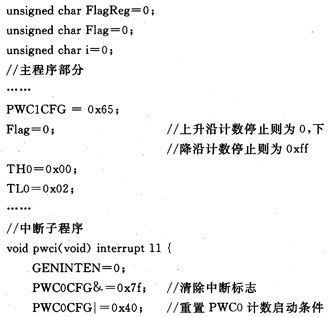 VRS51L3074單片機(jī)是由美國(guó)Ramtron(瑞創(chuàng))公司推出的8位單片機(jī)家族VRS51L3XXX系列的成員。VRSS1L3074提供了2個(gè)與定時(shí)器0和1關(guān)連的獨(dú)立的脈寬計(jì)數(shù)器(PWC)模塊,用戶(hù)可通過(guò)對(duì)PWC模塊和定時(shí)器的配置,靈活地控制定時(shí)器啟動(dòng)或停止計(jì)數(shù),從而方便地實(shí)現(xiàn)對(duì)ADXL202E輸出的脈寬和周期的計(jì)數(shù)。