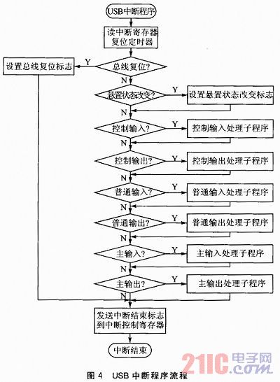 因為C8051F321的USB模塊高度集成化,所以對USB接口的設(shè)計主要是USB固件程序的設(shè)計。其中最重要的是USB描述符和USB傳輸中斷的處理。當USB中斷到達時,C8051F321首先讀取3個中斷寄存器(CMINT、IN1INT和OUT1INT)來判斷中斷來源(USB復位中斷、端點0中斷、端點1輸入中斷、端點2輸出中斷),然后跳入相應的處理模塊進行處理。USB中斷程序流程如圖4所示。